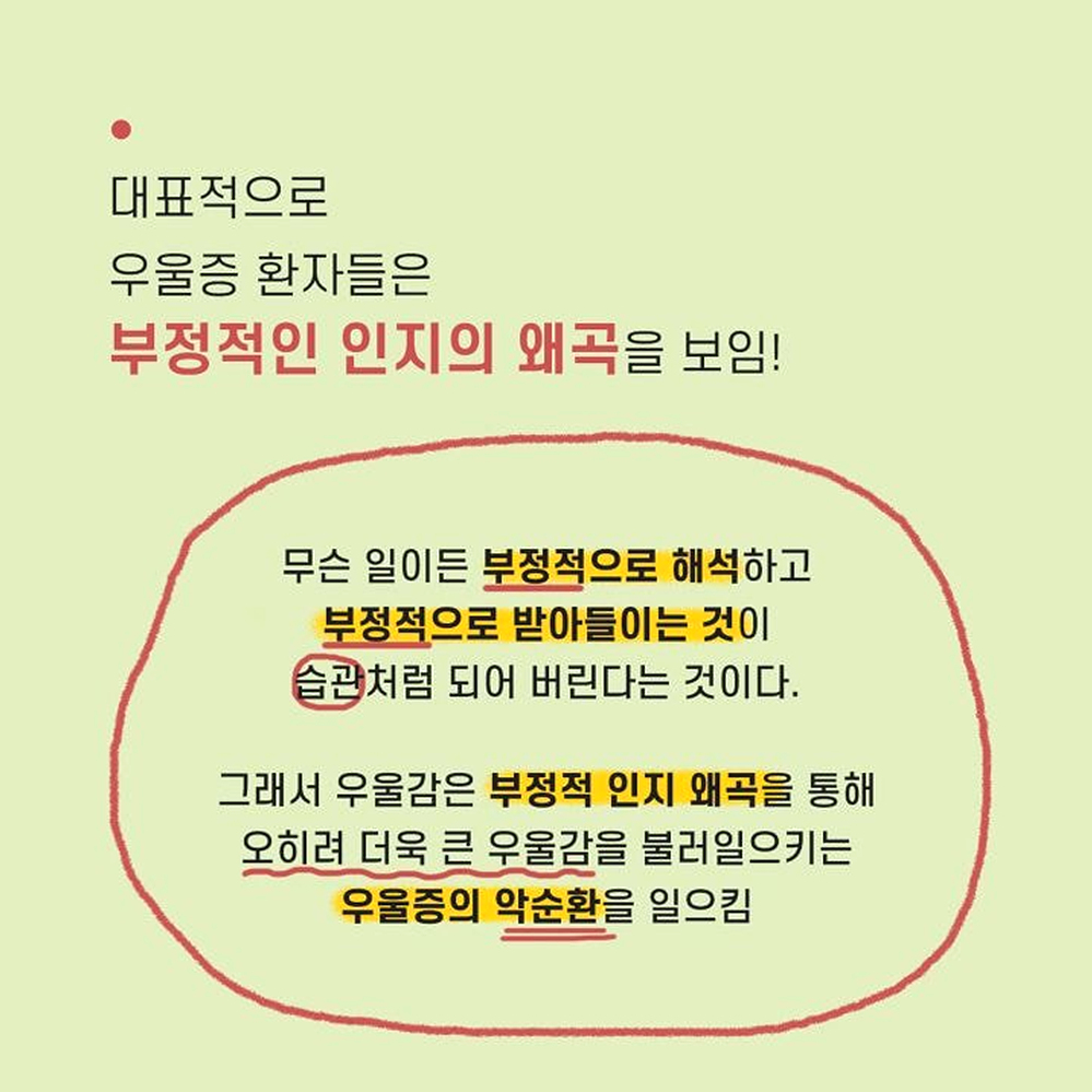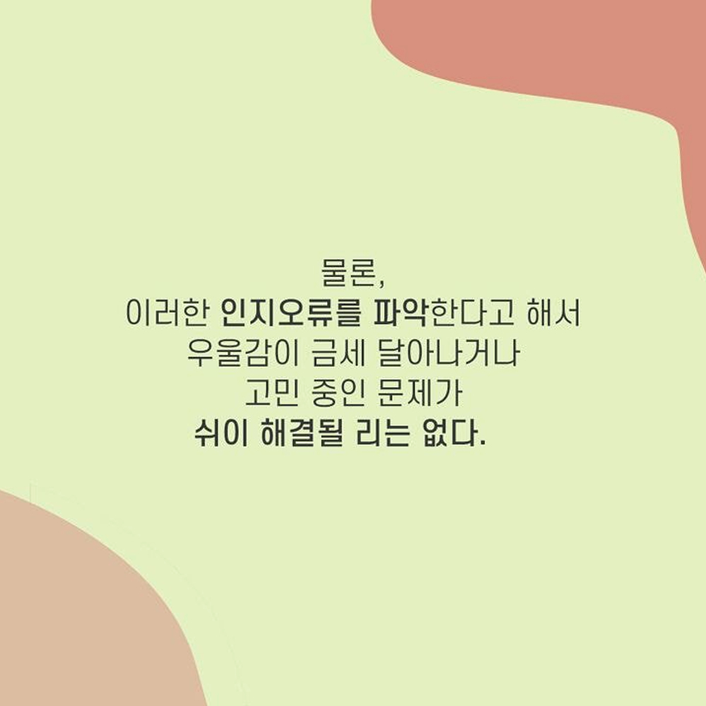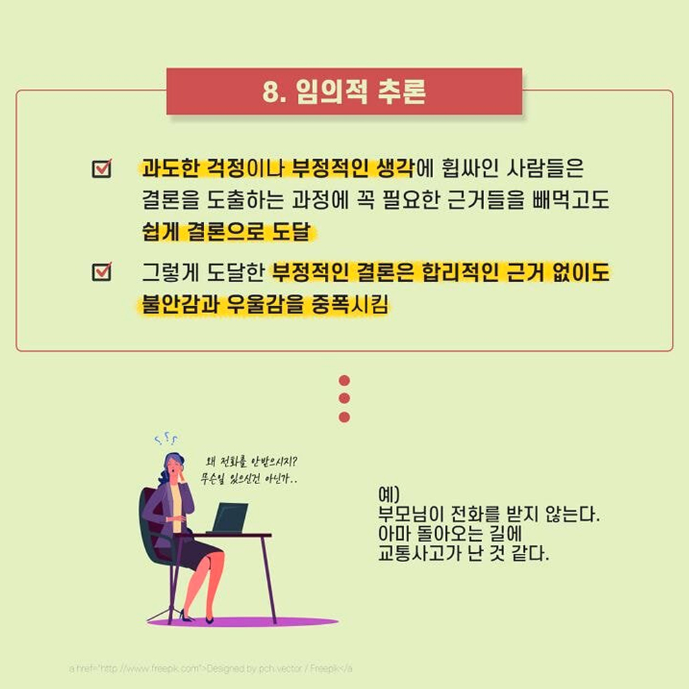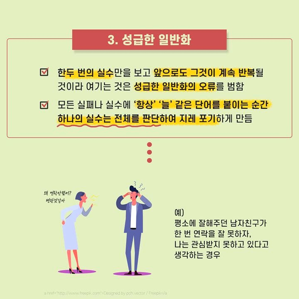 1. 이분법적 사고 어떤 사람들은 무슨 일이 일어나건 극단적으로 파멸하는 실패의 결과나 최고의 성공을 맛보는 두 가지 결과로만 미래를 예측하여 걱정을 증폭 시키는 경우가 있다. 혹은 한 번이라도 더럽혀지거나 한번이라도 실수한 것은 완전히 타락한 것이라 여기는 사람들도 있다. 예) 완벽하지 않은 것은 하지 않은 것만 못하다고 생각하는 경우. 한번이라도 순결을 잃으면 더럽혀진다고 생각하는 경우 2. 정신과적 여과 부정적인 사람들은 자신도 모르는 머리속 필터를 가지고 있다. 긍정적으로 해석할 수 있는 좋은 여지들은 걸러버리고 나쁜 일들만 남기곤 한다. 그리고 그것들을 바라보며 전체적인 모든 상황을 부정적으로 해석하게 된다. 예) 성공적으로 프로젝트를 잘 진행하고 칭찬 받았으나, 상사에게 트집 잡힌 일을 떠올리며 우울한 하루라 생각하는 경우 3. 성급한 일반화 한두 번의 실수만을 보고 앞으로도 그것이 계속 반복될 것이라 여기는 것은 성급한 일반화의 오류를 범하게 된다. 모든 실패나 실수에 ‘항상’ ‘늘’ 같은 단어를 붙이는 순간 하나의 실수는 전체를 판단하여 지레 포기하게 만든다. 예) 평소에 잘해주던 남자친구가 한 번 연락을 잘 못하자, 나는 관심받지 못하고 있다고 생각하는 경우 4. 개인화 시키기 어쩔 수 없었던 일마저 자신의 잘못이라고 생각하게 되는 인지적 오류는 과도한 죄책감을 불러 일으킨다. 자기가 통제할 수 없는 사건마저도 개인화 시키게 되면 모든게 나의 책임인 것처럼 여겨지게만 된다. 예) 클라이언트의 갑작스러운 변심으로 회사 일이 망가졌을 때, 내 잘못 때문이라고 자책하는 경우 5. 낙인 찍기 몇 가지 사건이나 한두 가지의 모습만 보고 그 사건이나 대상의 전체적인 특성을 정의해버리는 것은 낙인을 찍어버리는 것과 다름 없다. 낙인을 찍은 대상은 더 이상의 긍정적인 평가나 새로운 측면의 발견을 원천봉쇄하여 버린다. 예) 인사를 하지 못하고 지나쳐버린 후배를 버릇없는 놈이니 상종하지 말아야 한다고 생각하는 경우 6. ‘해야만 해’ 강박 어떤 사람들은 자신의 개인적인 기대나 바람을 꼭 그래야만 하는 일로 생각하여 판단하는 경우가 있다. 개인적인 바람은 이루어지지 않더라도 단순히 실망에 그칠 수 있지만, 반드시 그래야만 하는 일이 이루어지지 않게 되면 그것은 강렬한 분노를 일으키게 된다. 혹은 해야만 하는 일을 하지 못한 스스로에게 죄책감을 느끼기도 한다. 예) 형편이 되지 않아 집을 사주지 않는 부모에게 분노하고 비난하는 경우. 7. 감정적 추론 감정이 생각보다 지나치게 앞서는 사람들은 자신이 그렇게 ‘느끼기’ 때문에 그것은 ‘그러하다’고 쉽게 판단해버리는 경향이 있다. 그렇지만 감정적인 판단은 사실 여부나 합리성을 항상 동반하지는 않는다. 예) 나는 이번 일을 하면서 불쾌감을 느낀다. 그러므로 이 일은 잘못되어 가고 있다. 8. 임의적 추론 과도한 걱정이나 부정적인 생각에 휩싸인 사람들은 결론을 도출하는 과정에 꼭 필요한 근거들을 빼먹고도 쉽게 결론으로 도달한다. 그렇게 도달한 부정적인 결론은 합리적인 근거 없이도 불안감과 우울감을 증폭시킨다. 예) 부모님이 전화를 받지 않는다. 아마 돌아오는 길에 교통사고가 난 것 같다. 만약 부정적인 생각에 휩싸여 우울한 하루를 보내고 있는 사람이라면 위의 예 중에 공감하는 바가 있을지 모른다. 위에 소개된 것들 말고도 다른 여러 종류의 인지 오류가 있을 수 있다. 물론, 이러한 인지 오류를 파악한다고 해서 우울감이 금세 달아나거나 고민 중인 문제가 쉬이 해결될 리는 없다. 하지만 적어도 인지 오류를 찾아보려는 노력 그 자체가 스스로의 감정과 걱정을 객관화하고 조금더 차분하게 돌아볼 수 있는 여유를 가져다 줄 수 있을 것이다.