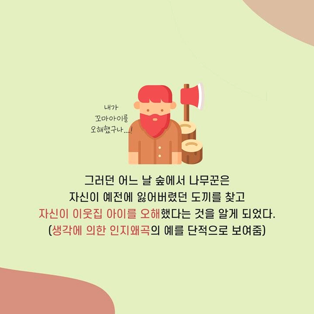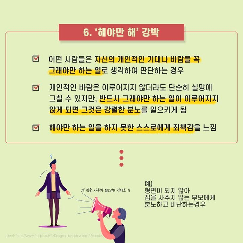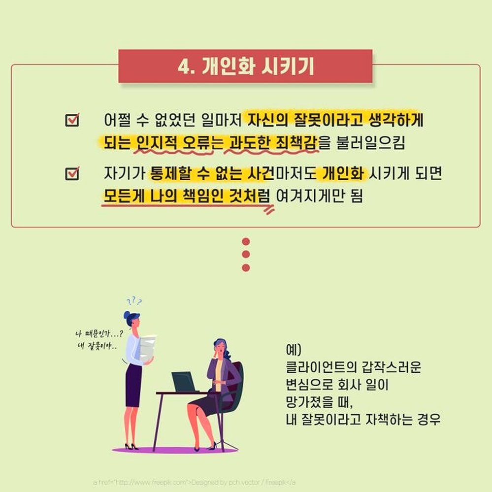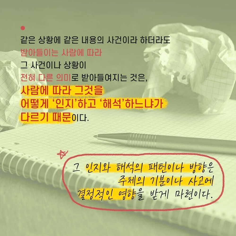 1. 이분법적 사고 어떤 사람들은 무슨 일이 일어나건 극단적으로 파멸하는 실패의 결과나 최고의 성공을 맛보는 두 가지 결과로만 미래를 예측하여 걱정을 증폭 시키는 경우가 있다. 혹은 한 번이라도 더럽혀지거나 한번이라도 실수한 것은 완전히 타락한 것이라 여기는 사람들도 있다. 예) 완벽하지 않은 것은 하지 않은 것만 못하다고 생각하는 경우. 한번이라도 순결을 잃으면 더럽혀진다고 생각하는 경우 2. 정신과적 여과 부정적인 사람들은 자신도 모르는 머리속 필터를 가지고 있다. 긍정적으로 해석할 수 있는 좋은 여지들은 걸러버리고 나쁜 일들만 남기곤 한다. 그리고 그것들을 바라보며 전체적인 모든 상황을 부정적으로 해석하게 된다. 예) 성공적으로 프로젝트를 잘 진행하고 칭찬 받았으나, 상사에게 트집 잡힌 일을 떠올리며 우울한 하루라 생각하는 경우 3. 성급한 일반화 한두 번의 실수만을 보고 앞으로도 그것이 계속 반복될 것이라 여기는 것은 성급한 일반화의 오류를 범하게 된다. 모든 실패나 실수에 ‘항상’ ‘늘’ 같은 단어를 붙이는 순간 하나의 실수는 전체를 판단하여 지레 포기하게 만든다. 예) 평소에 잘해주던 남자친구가 한 번 연락을 잘 못하자, 나는 관심받지 못하고 있다고 생각하는 경우 4. 개인화 시키기 어쩔 수 없었던 일마저 자신의 잘못이라고 생각하게 되는 인지적 오류는 과도한 죄책감을 불러 일으킨다. 자기가 통제할 수 없는 사건마저도 개인화 시키게 되면 모든게 나의 책임인 것처럼 여겨지게만 된다. 예) 클라이언트의 갑작스러운 변심으로 회사 일이 망가졌을 때, 내 잘못 때문이라고 자책하는 경우 5. 낙인 찍기 몇 가지 사건이나 한두 가지의 모습만 보고 그 사건이나 대상의 전체적인 특성을 정의해버리는 것은 낙인을 찍어버리는 것과 다름 없다. 낙인을 찍은 대상은 더 이상의 긍정적인 평가나 새로운 측면의 발견을 원천봉쇄하여 버린다. 예) 인사를 하지 못하고 지나쳐버린 후배를 버릇없는 놈이니 상종하지 말아야 한다고 생각하는 경우 6. ‘해야만 해’ 강박 어떤 사람들은 자신의 개인적인 기대나 바람을 꼭 그래야만 하는 일로 생각하여 판단하는 경우가 있다. 개인적인 바람은 이루어지지 않더라도 단순히 실망에 그칠 수 있지만, 반드시 그래야만 하는 일이 이루어지지 않게 되면 그것은 강렬한 분노를 일으키게 된다. 혹은 해야만 하는 일을 하지 못한 스스로에게 죄책감을 느끼기도 한다. 예) 형편이 되지 않아 집을 사주지 않는 부모에게 분노하고 비난하는 경우. 7. 감정적 추론 감정이 생각보다 지나치게 앞서는 사람들은 자신이 그렇게 ‘느끼기’ 때문에 그것은 ‘그러하다’고 쉽게 판단해버리는 경향이 있다. 그렇지만 감정적인 판단은 사실 여부나 합리성을 항상 동반하지는 않는다. 예) 나는 이번 일을 하면서 불쾌감을 느낀다. 그러므로 이 일은 잘못되어 가고 있다. 8. 임의적 추론 과도한 걱정이나 부정적인 생각에 휩싸인 사람들은 결론을 도출하는 과정에 꼭 필요한 근거들을 빼먹고도 쉽게 결론으로 도달한다. 그렇게 도달한 부정적인 결론은 합리적인 근거 없이도 불안감과 우울감을 증폭시킨다. 예) 부모님이 전화를 받지 않는다. 아마 돌아오는 길에 교통사고가 난 것 같다. 만약 부정적인 생각에 휩싸여 우울한 하루를 보내고 있는 사람이라면 위의 예 중에 공감하는 바가 있을지 모른다. 위에 소개된 것들 말고도 다른 여러 종류의 인지 오류가 있을 수 있다. 물론, 이러한 인지 오류를 파악한다고 해서 우울감이 금세 달아나거나 고민 중인 문제가 쉬이 해결될 리는 없다. 하지만 적어도 인지 오류를 찾아보려는 노력 그 자체가 스스로의 감정과 걱정을 객관화하고 조금더 차분하게 돌아볼 수 있는 여유를 가져다 줄 수 있을 것이다.